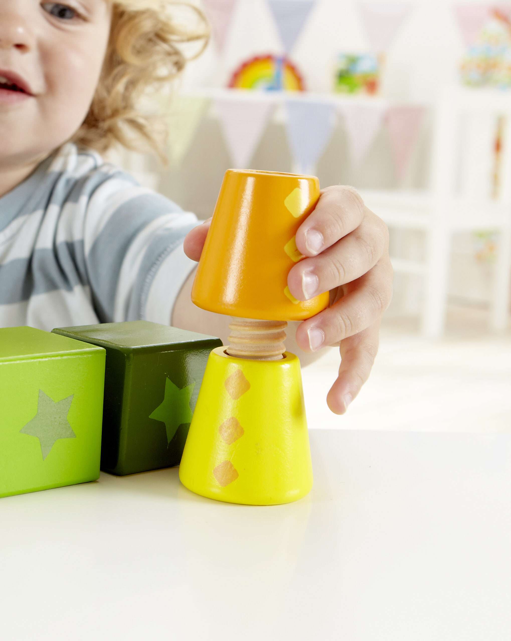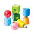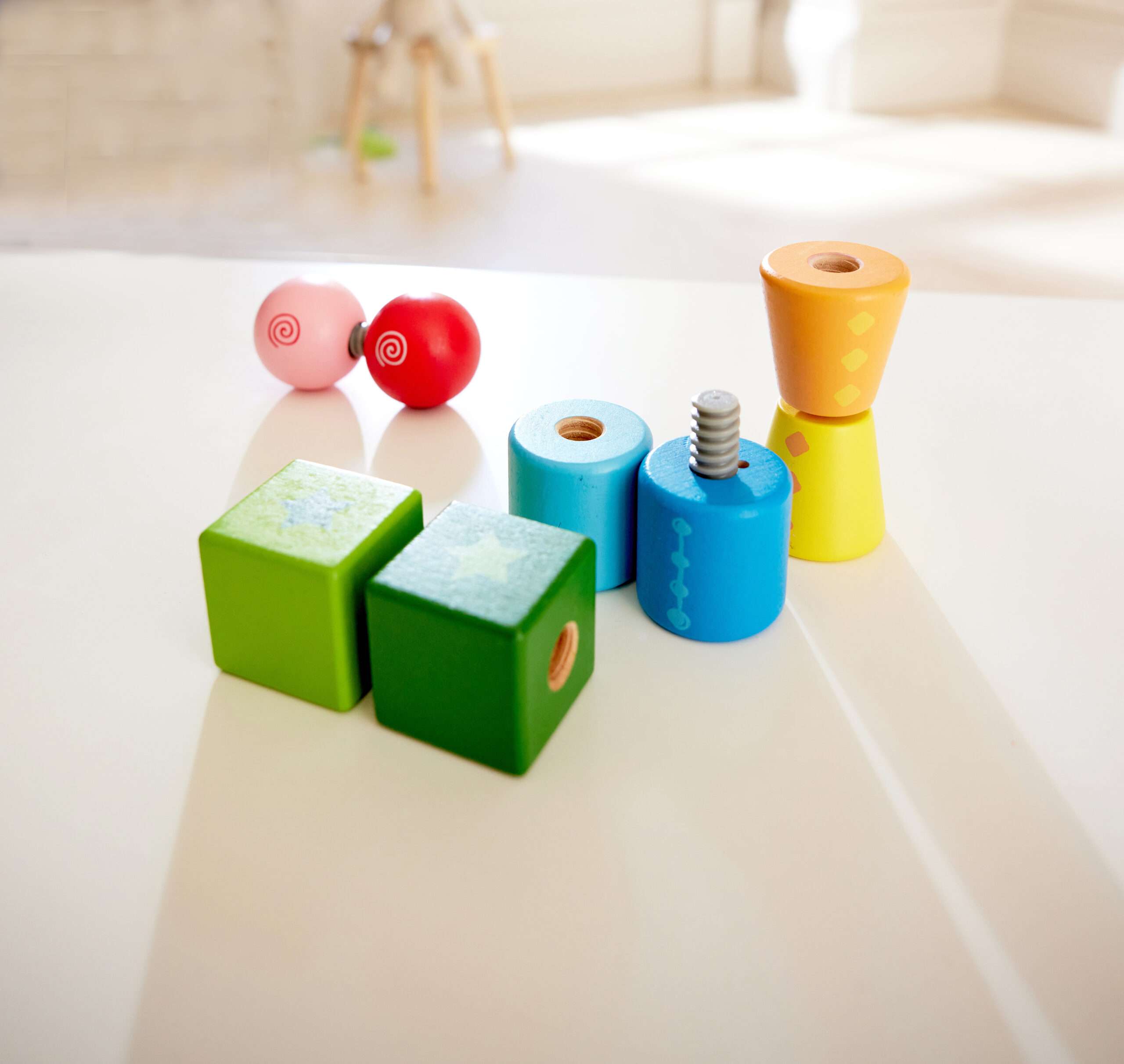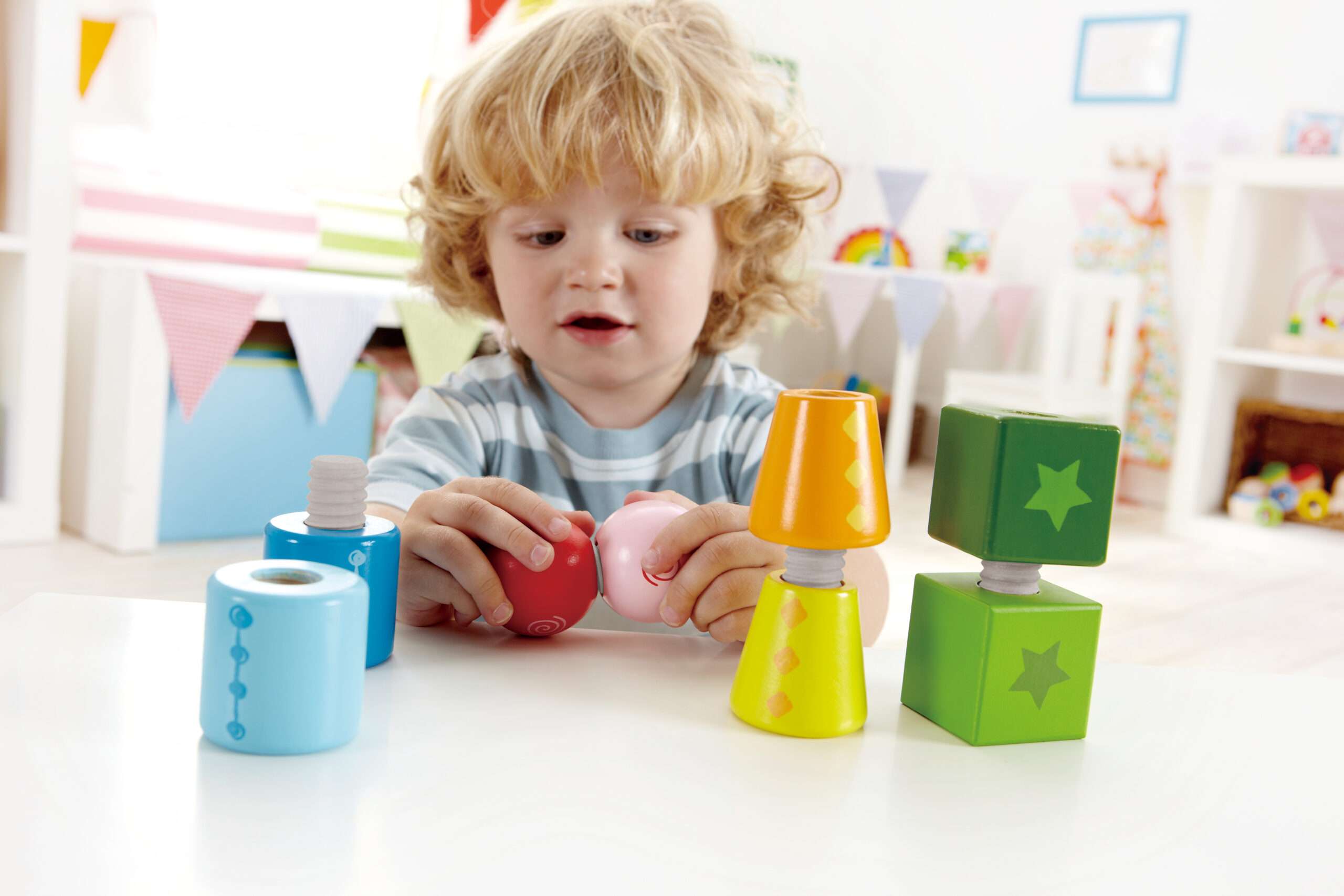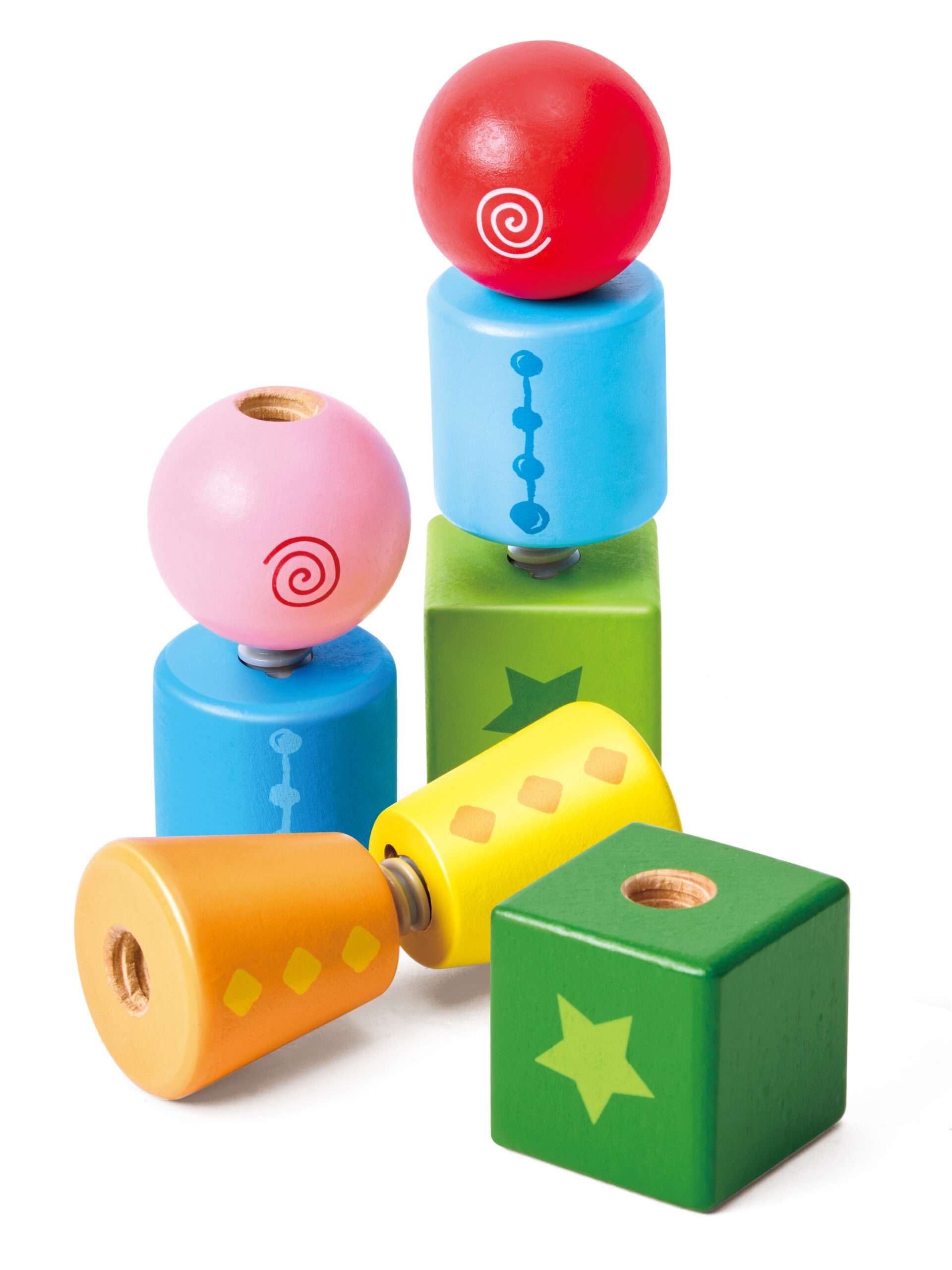 A színes, mintázott fa elemek – hengerek, kockák és kúpos formák – csavarható csatlakozókkal kapcsolódnak egymáshoz. A gyermek a kéz finom forgó mozdulatával rögzíti az elemeket, így az építés aktív, tudatos mozgássá válik. A csavarás élménye egyszerre fejleszti a kézügyességet és a koncentrációt.