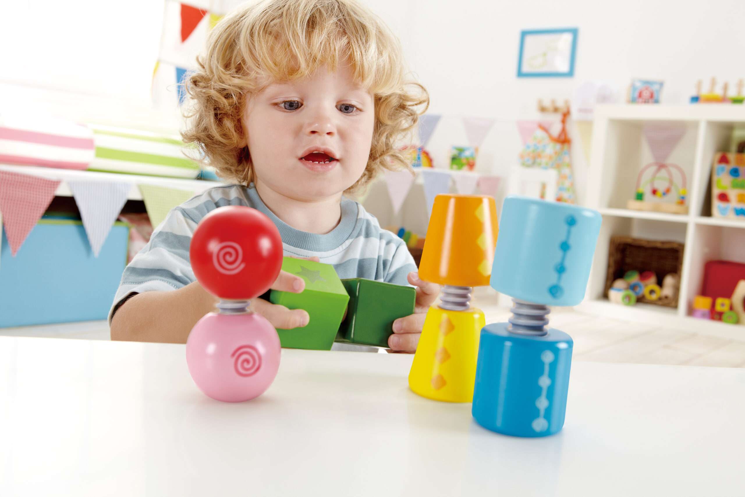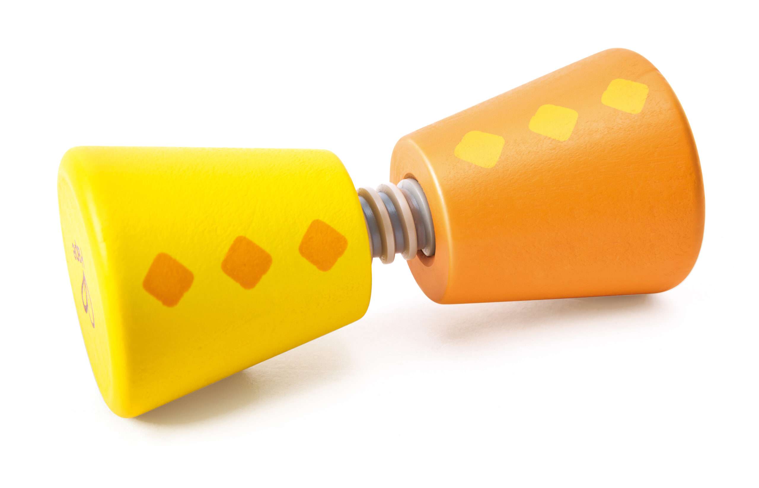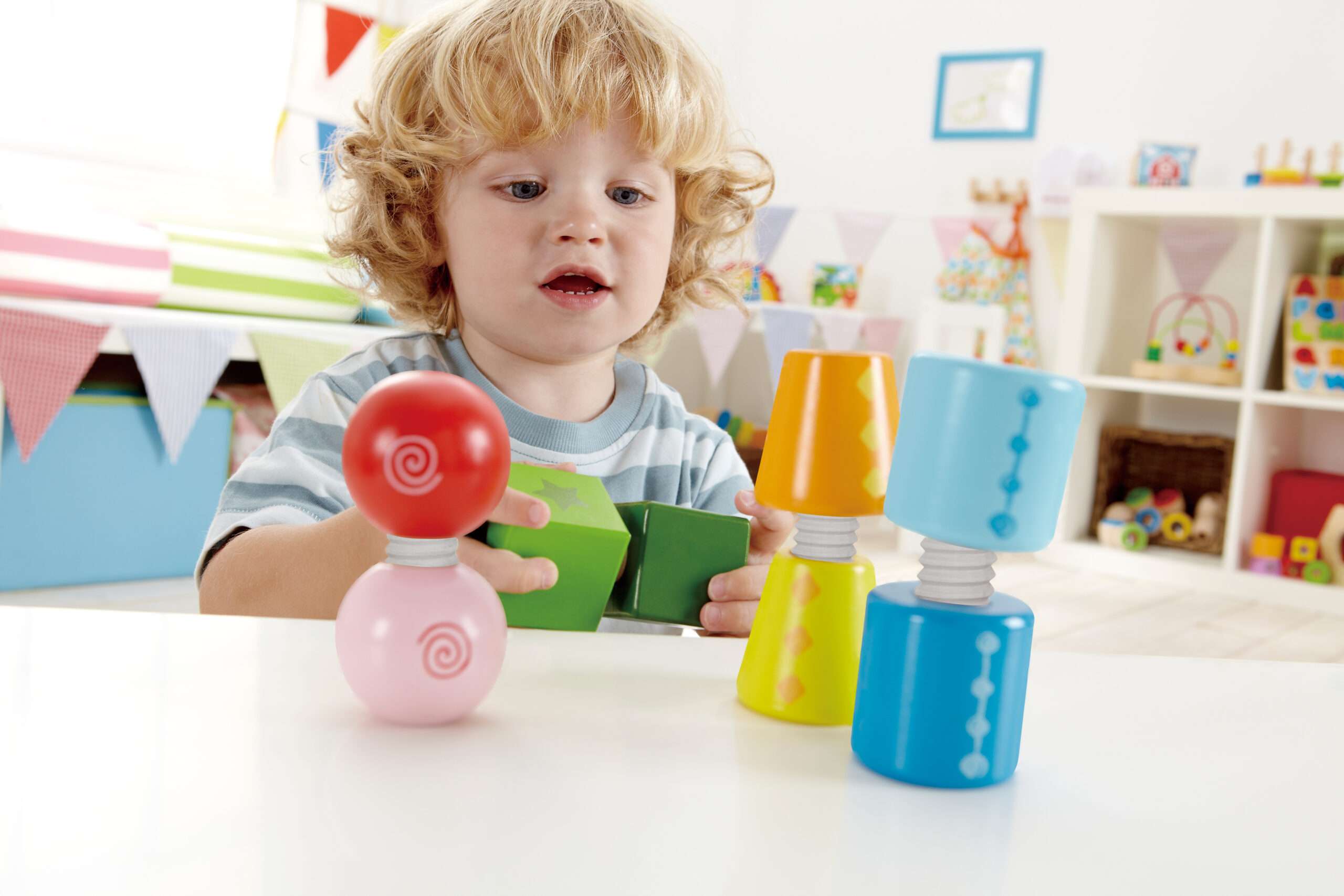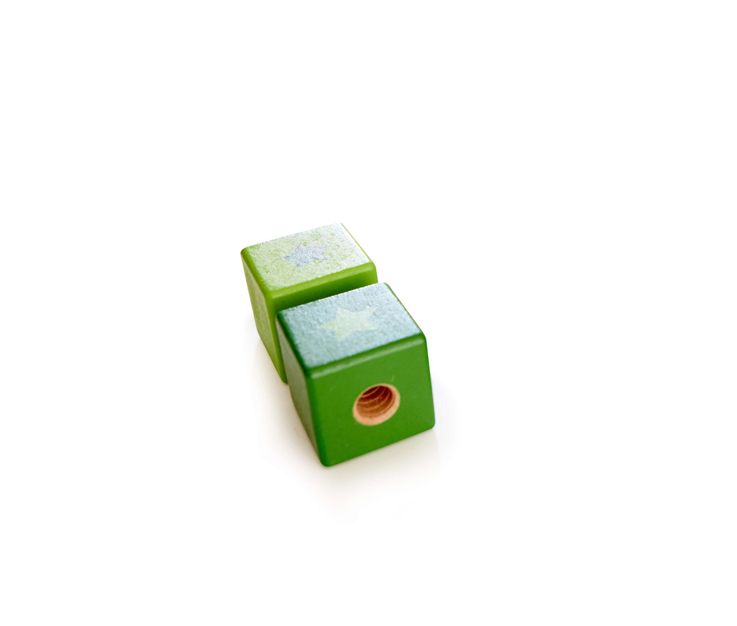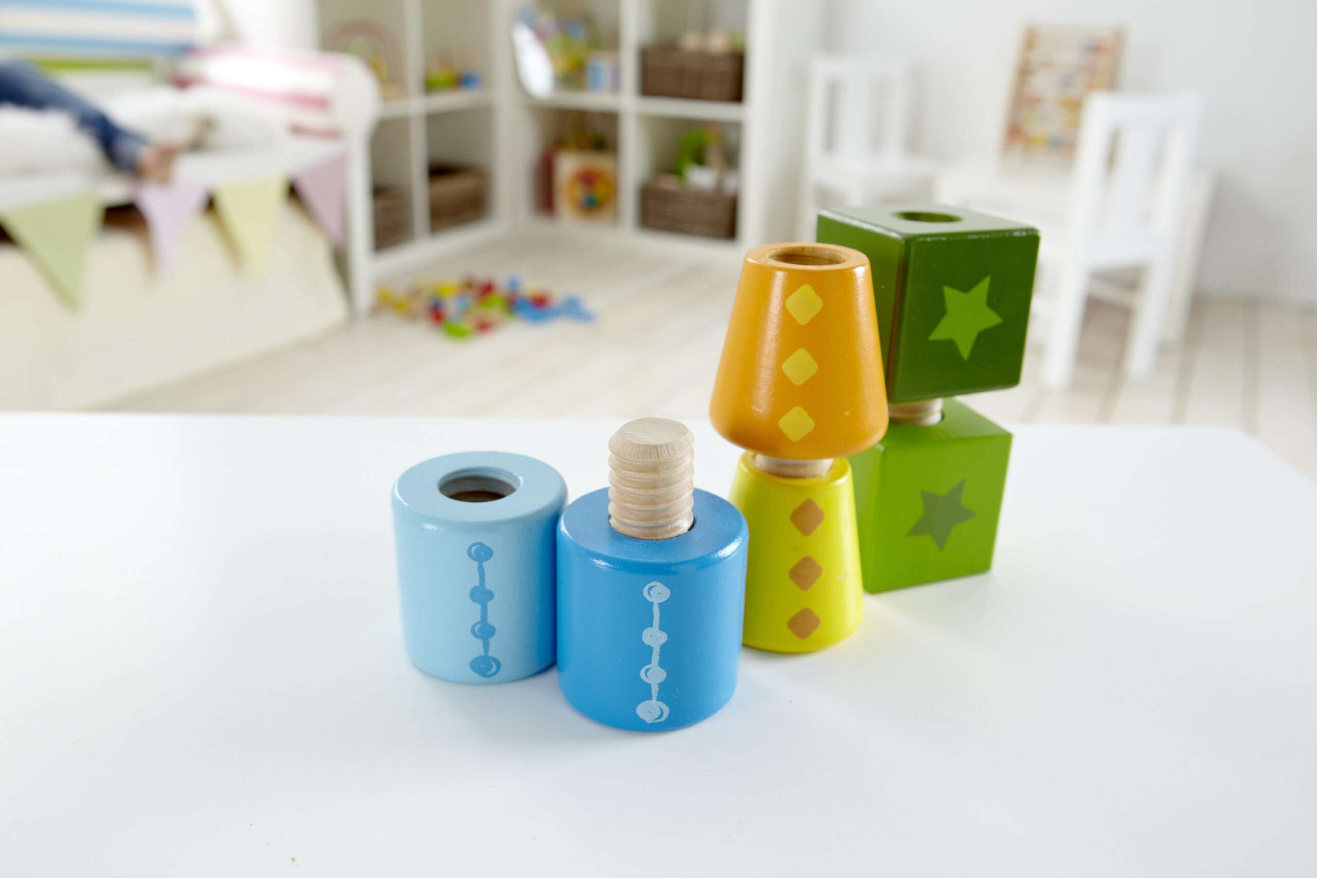 A színes, mintázott fa elemek – hengerek, kockák és kúpos formák – csavarható csatlakozókkal kapcsolódnak egymáshoz. A gyermek a kéz finom forgó mozdulatával rögzíti az elemeket, így az építés aktív, tudatos mozgássá válik. A csavarás élménye egyszerre fejleszti a kézügyességet és a koncentrációt.